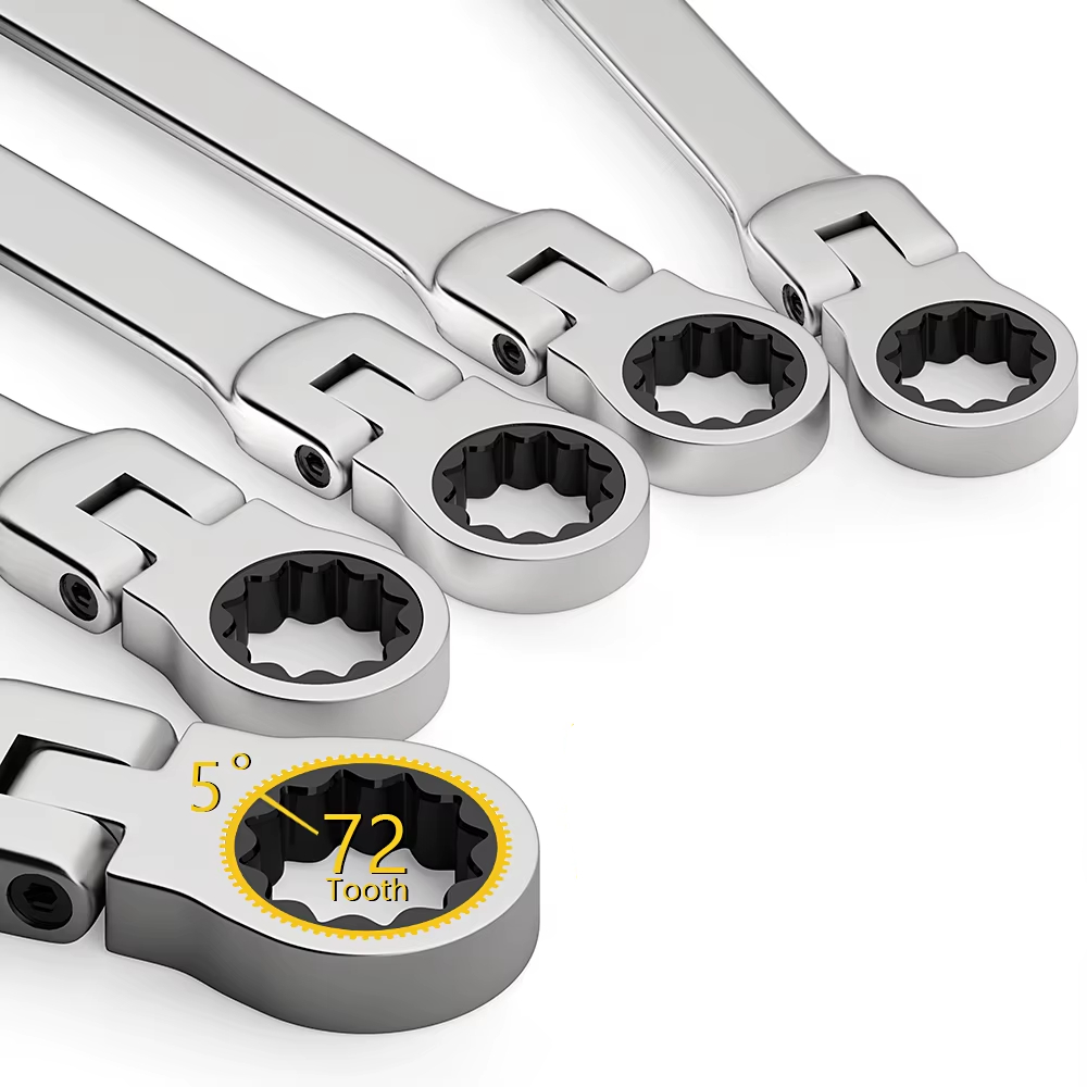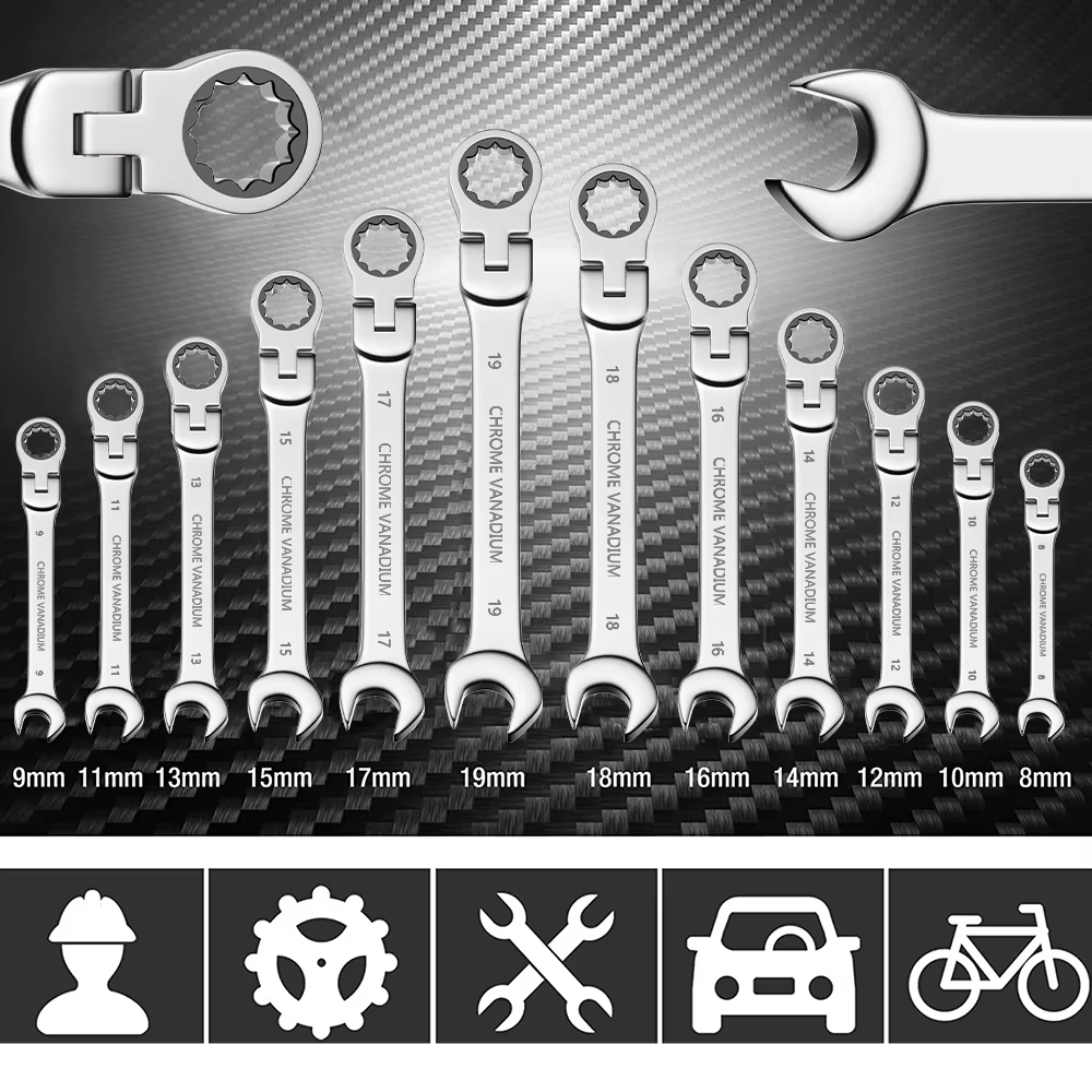 [RESISTENTE Y DURADERO] Juego de llaves combinadas con trinquete de cabeza flexible hecho de acero al cromo vanadio de alta calidad y acabado en cromo altamente pulido.